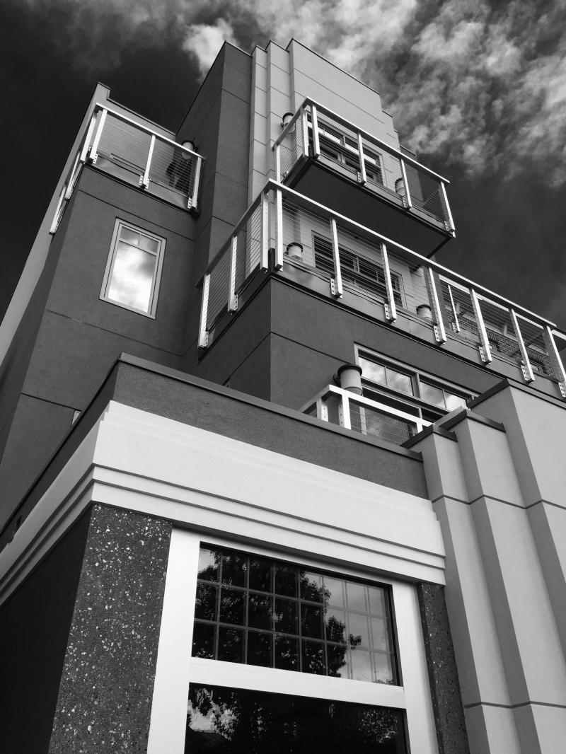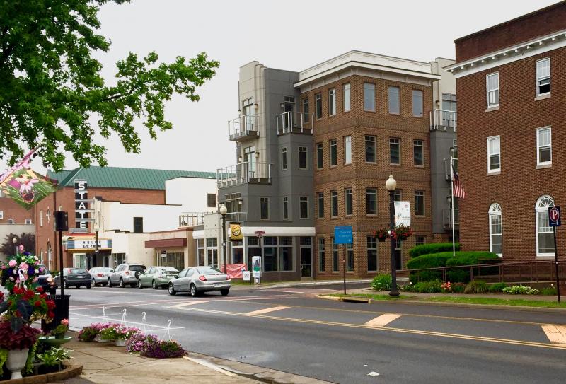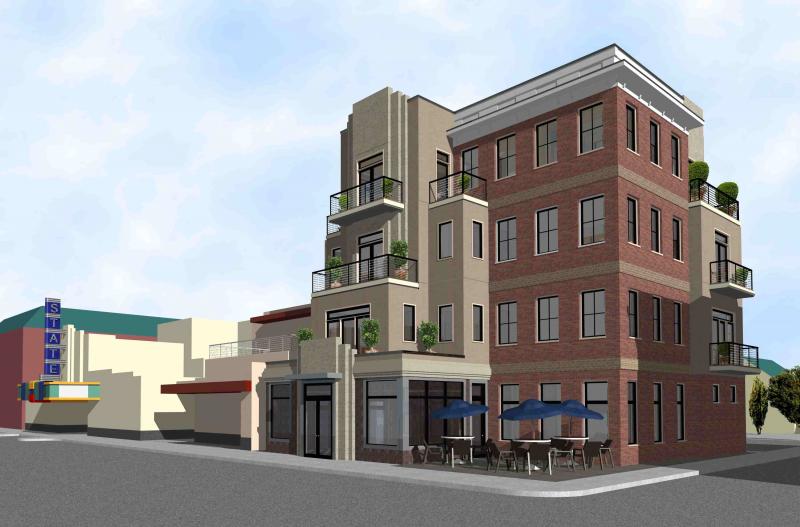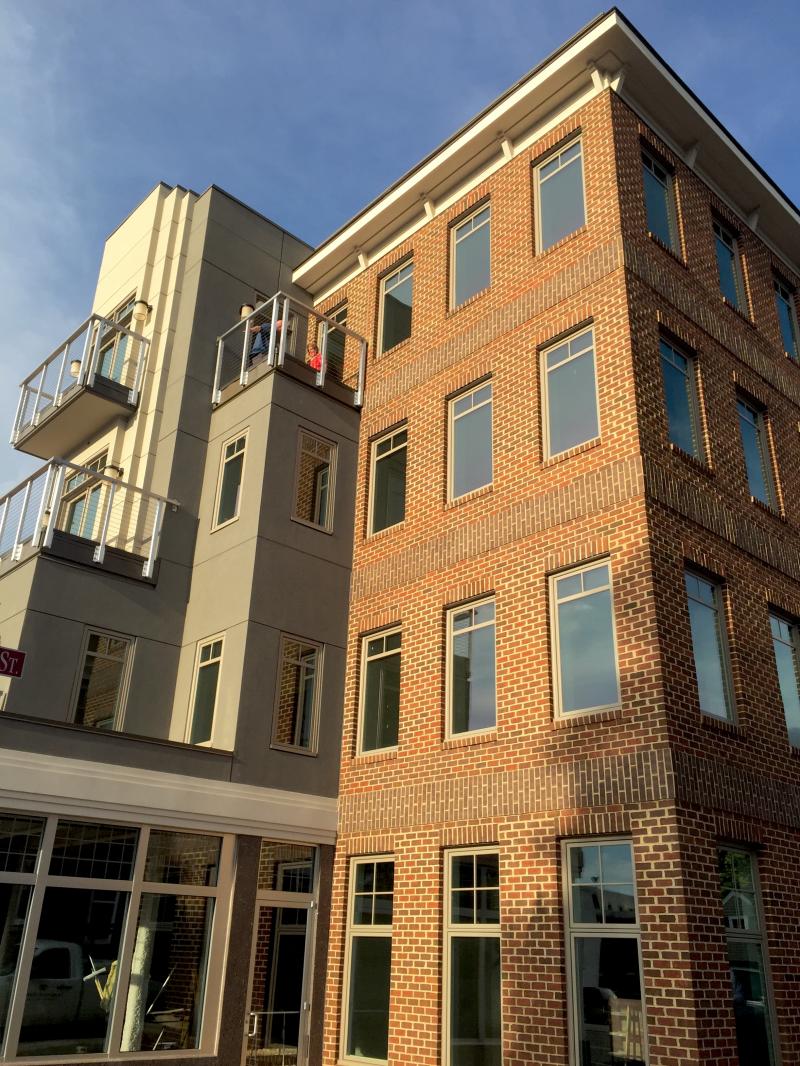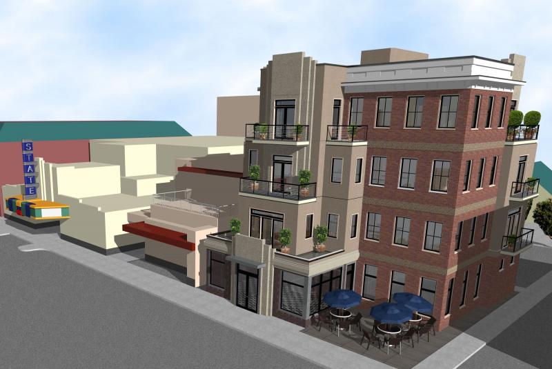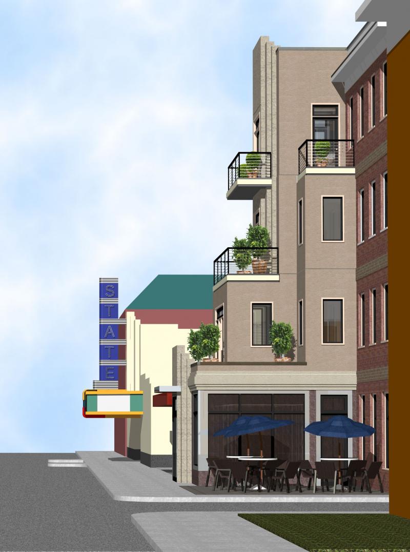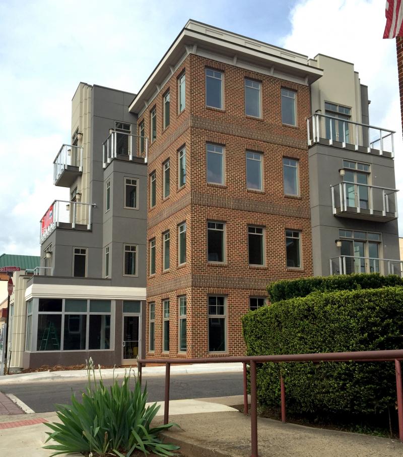 Construction is completed on Culpeper's first new 4-story building. Sandwiched between two Culpeper landmarks, the building is designed to ease the transition between the Georgian Revival Lord Culpeper Hotel and the Art Deco State Theater. The stepped facade provides the apartment units with outdoor balconies and serves to relieve the vertical impact of a 4-story mass on the street. Plan offsets create outdoor dining space for the proposed ground-floor restaurant.